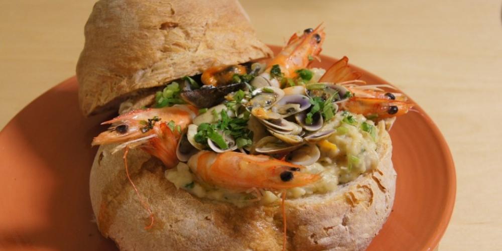 Lave bem os mariscos em água fria. De seguida, coloque-os em recipientes separados, cobrindo-os com água e um pouco sal. Depois, coza-os num tacho com água, juntando a cebola picada fina e uns talos de coentros.Escorra o caldo onde cozeu os mariscos usando um passador fino, retire-lhes o miolo e reserve. Demolhe o pão caseiro, retirando a côdea num pouco do caldo do marisco cozido. Num tacho à parte, refogue os dentes de alho com a cebola picada e um fio de azeite. Quando estiver quase alourado, junte o restante caldo onde cozeu os mariscos e deixe levantar fervura. Junte o pão ao caldo mexendo com uma colher até obter uma massa grossa. Adicione os miolos dos mariscos, os coentros picados. Parta os ovos e ponha-os a cozer com a açorda. Decore com um pouco de bivalves com casca, abertos à parte com um fio de azeite, alho e coentros.